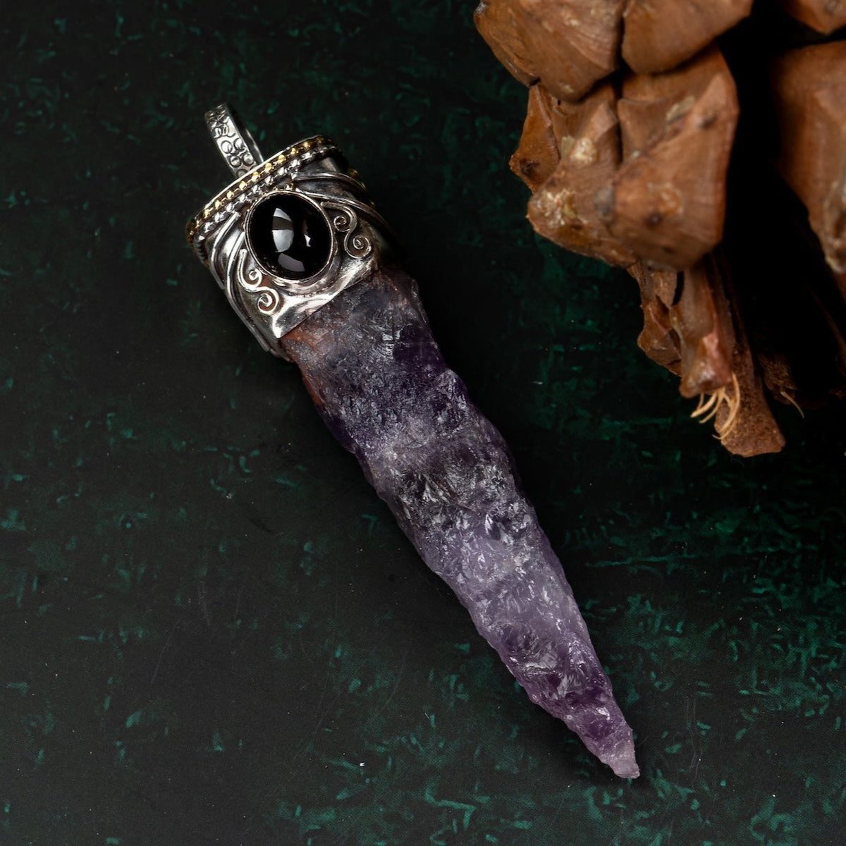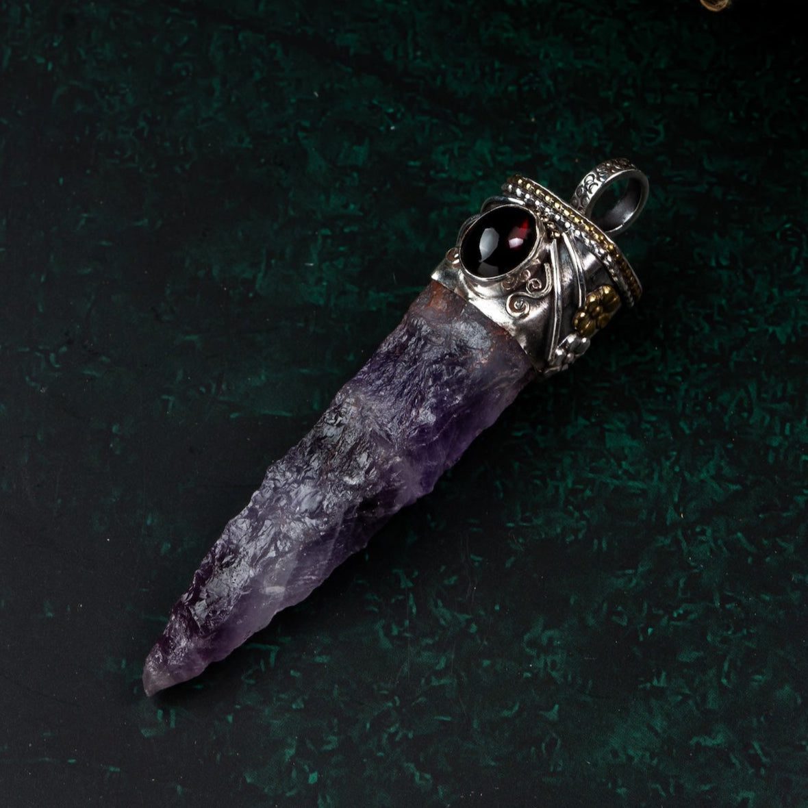 This unique Amethyst Point Pendant with Garnet combines the tranquil clarity of natural amethyst with the vibrant energy of garnet. The raw-point amethyst is left in its natural shape to preserve its pure energy channels, while the polished garnet cabochon adds a touch of warmth and vitality. Hand-set in an artisan silver cap with intricate detailing, this pendant is ideal for meditation, spiritual protection, and mindful living.