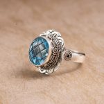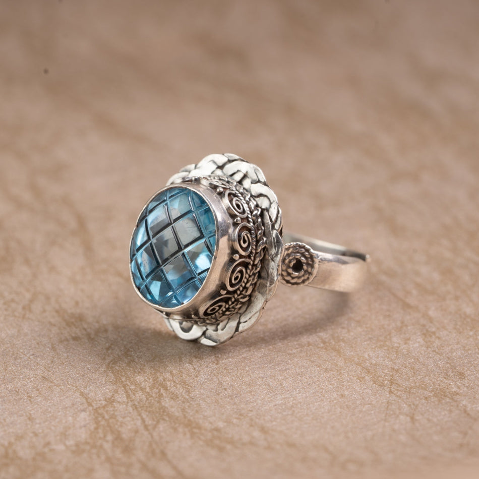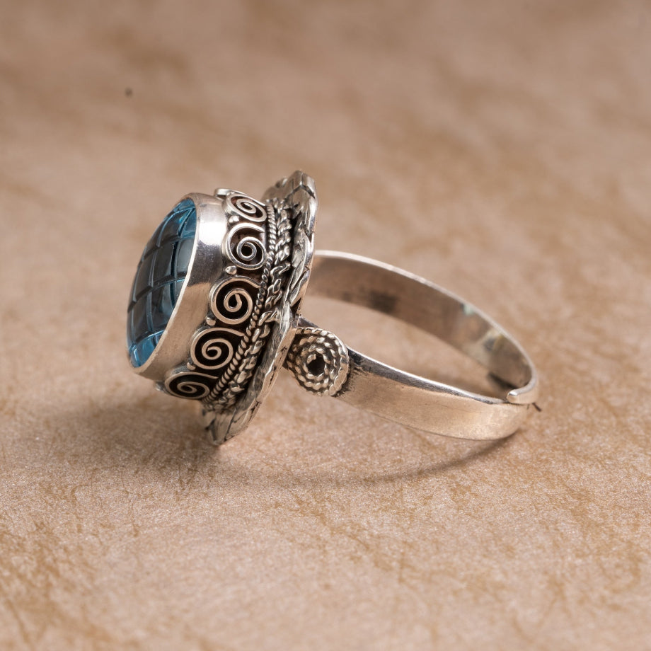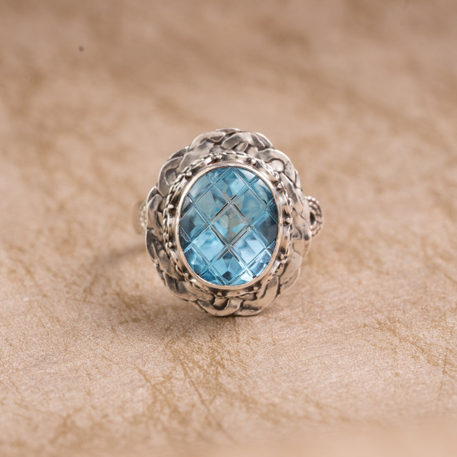 An oval blue topaz with a luminous checkerboard cut rises above a hand-wrought floral halo of 925 sterling silver. Rope-textured bezel, braided and granulated details, and oxidized swirl shoulders frame the gem’s serene sky-blue glow. Celebrated for soothing the mind and opening honest expression, this piece brings poised clarity to everyday wear.