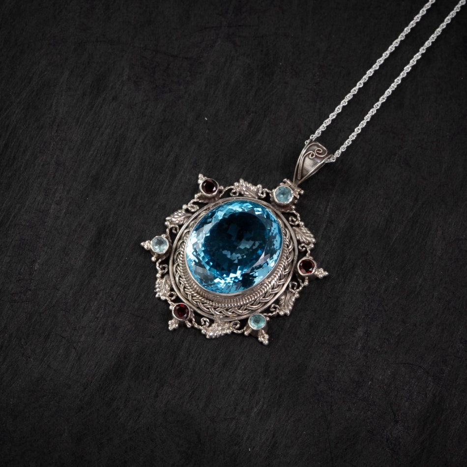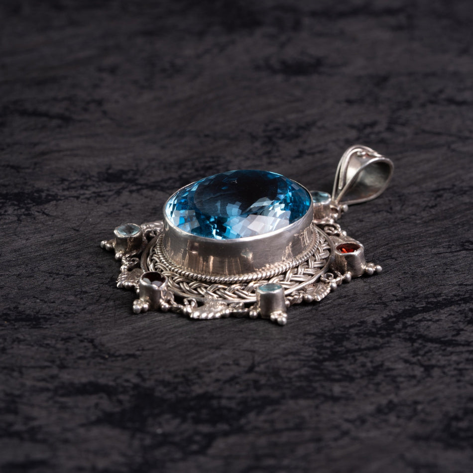 A brilliantly faceted oval blue topaz rises from an ornate starburst silver halo, highlighted by small cool-blue and deep wine-red accents. Regal yet serene, this statement pendant invites clear expression and poised calm—equally striking with everyday looks or mindful rituals.