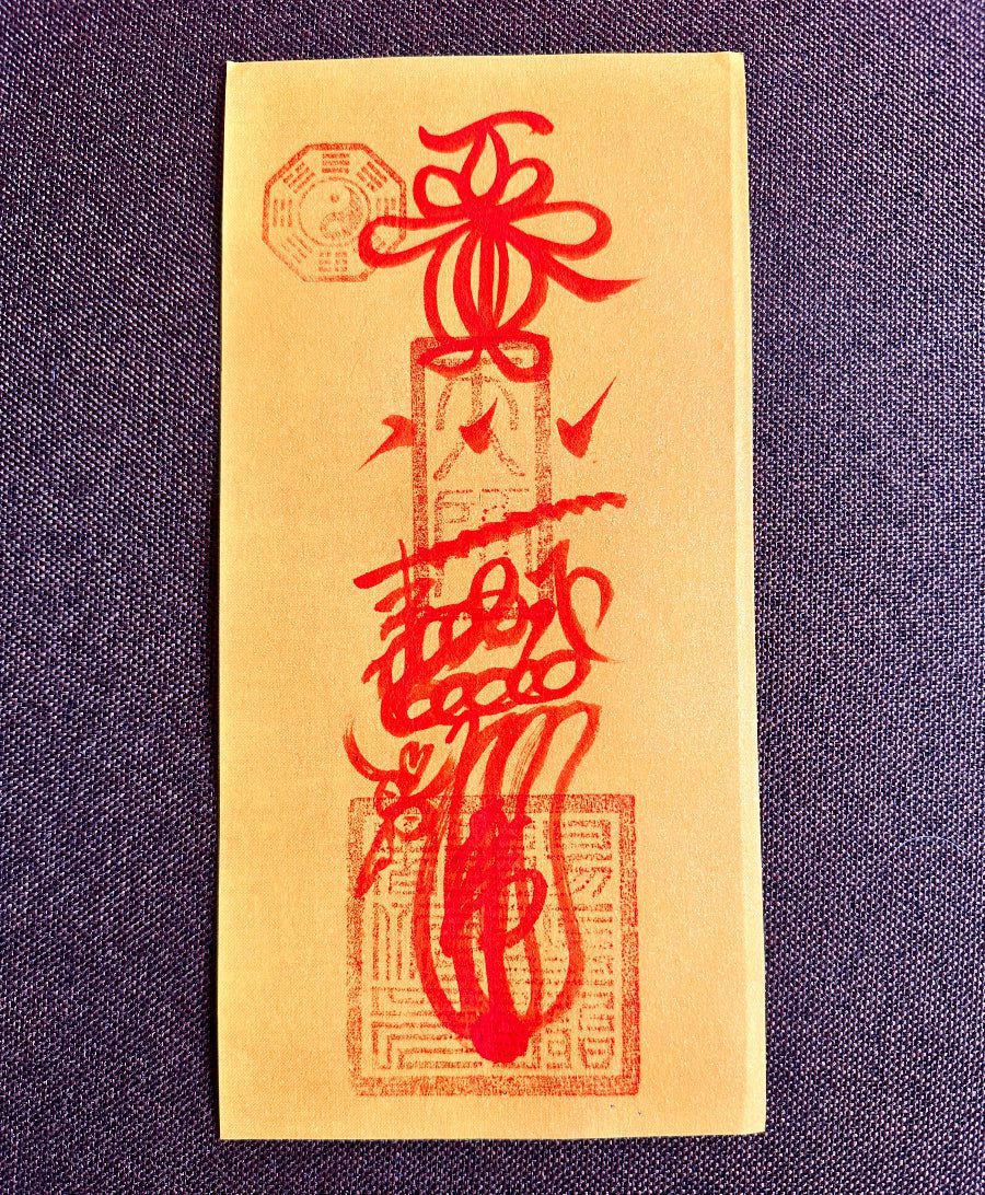Material: yellow talisman paper with red ink; stamped Bagua & altar seals