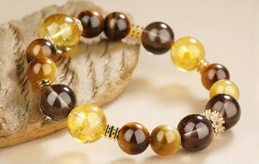 A grounded-yet-bright pairing of citrine, smoky quartz, and golden tiger’s eye, finished with warm yellow “A-Sai” agate accents (trade name; chalcedony family). Honey-gold citrine lifts the mood, tiger’s eye adds silky chatoyancy and steady confidence, while smoky quartz softens edges with calm, earthy depth. Hand-strung on durable elastic, the bracelet feels cool at first touch and quickly warms to the skin—an easy piece for work, travel, and intention setting.