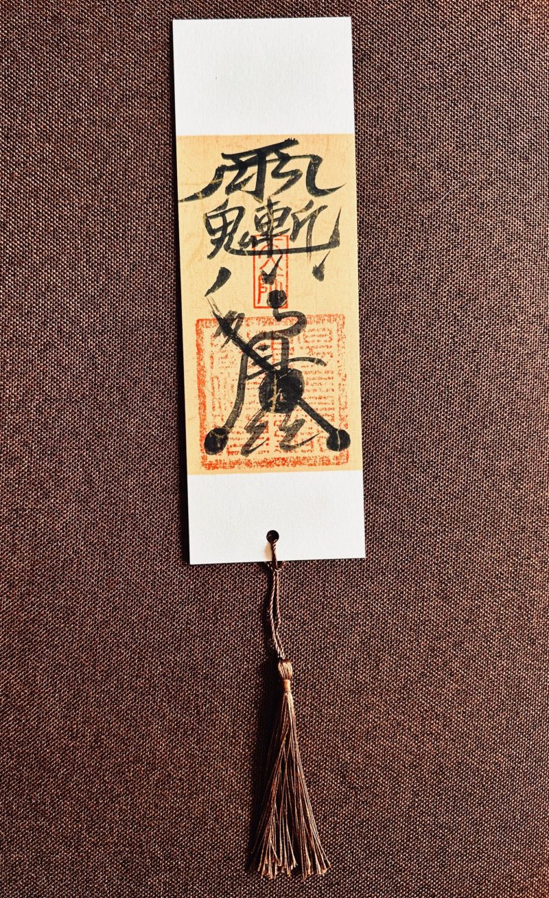 Material: ivory bookmark card with black sumi calligraphy; red Bagua/altar seal impressions; pre-punched hole & tassel