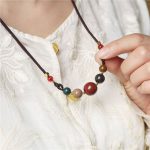 Crafted in a quiet, heritage style, this minimalist necklace centers a row of incense beads—hand-formed from traditional herbal aromatics—arranged in a five-elements palette (Metal, Wood, Water, Fire, Earth). Each bead carries a soft, resin-sealed scent and a silky matte sheen, balanced by petite metal spacers and a slim braided cord. The collarbone length makes it an easy everyday piece that layers well without visual weight.