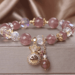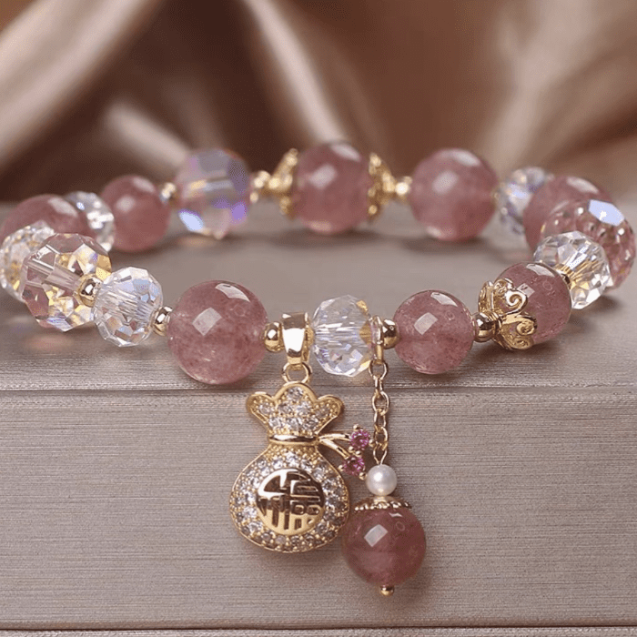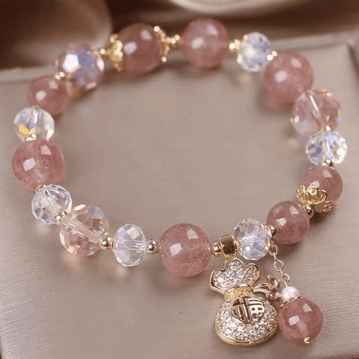 Delicate and radiant, the Fortune Bloom Bracelet is crafted from natural strawberry quartz — a gemstone cherished for its warm pink hue and gentle energy. Each bead glows with natural inclusions reminiscent of strawberry seeds, symbolizing love, attraction, and harmony. The gold money bag charm, adorned with sparkling crystals, represents prosperity and the steady flow of good fortune. A perfect balance of beauty and blessing, this bracelet brings positivity and emotional warmth to everyday life.