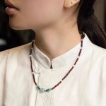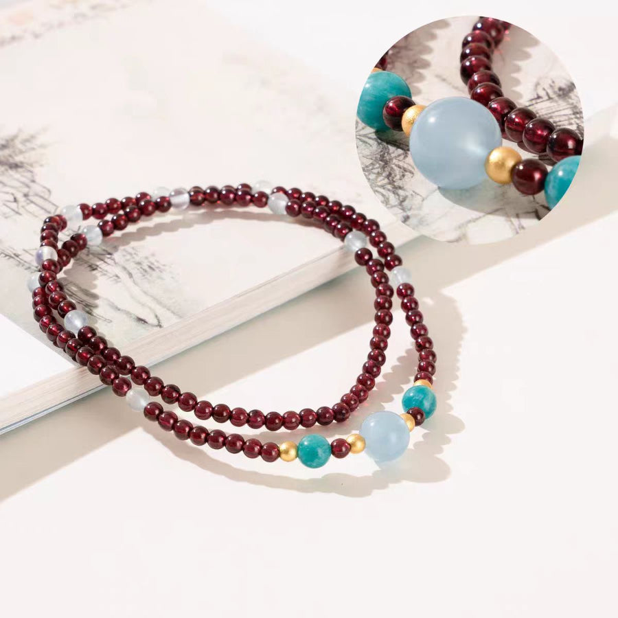 A refined strand of wine-red garnet micro-beads, centered with a misty-blue aquamarine focal and two serene amazonite accents. The palette is quiet but vivid—calm sea blue and fresh green lifted by garnet’s deep glow—made for everyday ease and intention.