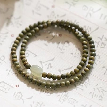 These mala-inspired bracelets are crafted from natural wooden beads and centered with a single polished jade accent bead. Each bracelet wraps gracefully around the wrist, blending traditional elegance with spiritual meaning. Wood symbolizes grounding & strength, while jade is revered for protection & harmony. Available in four distinct wood tones—black, brown, red, and green—these bracelets are ideal for meditation, mindfulness, or daily wear as versatile talismans.