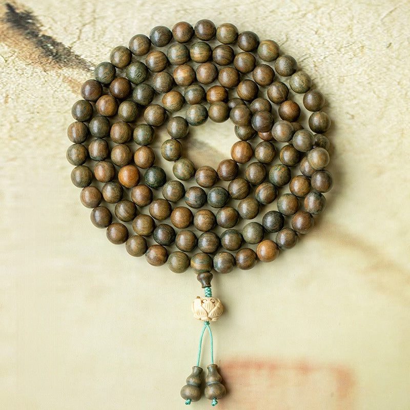 • Materials: Natural green sandalwood beads, carved lotus bead, wooden gourd accents, durable cord