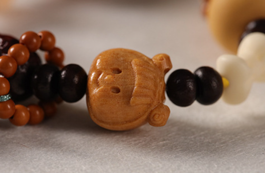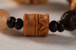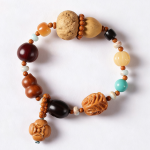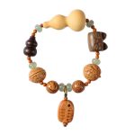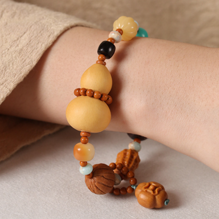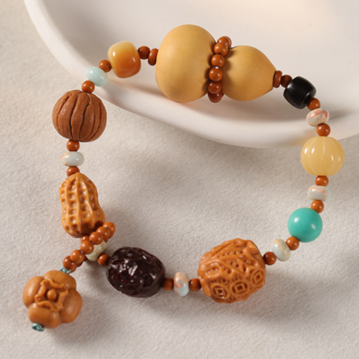 • Materials: Natural wood beads, carved gourds, walnuts, stone accents, elastic cord