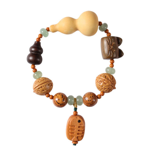 3. Gourd & Walnut Bead Bracelet with Fish Pendant – Combines walnut beads, gourds & a carved fish pendant symbolizing abundance & protection.
