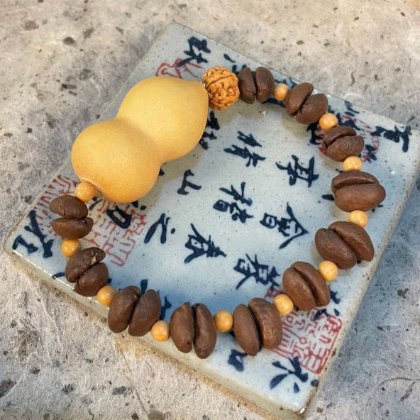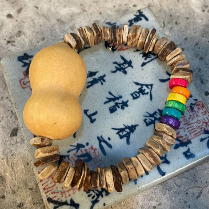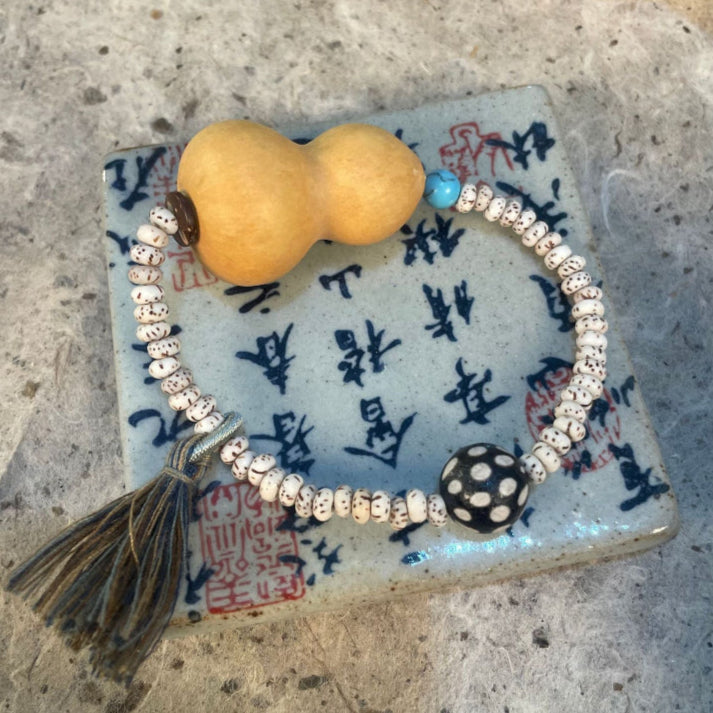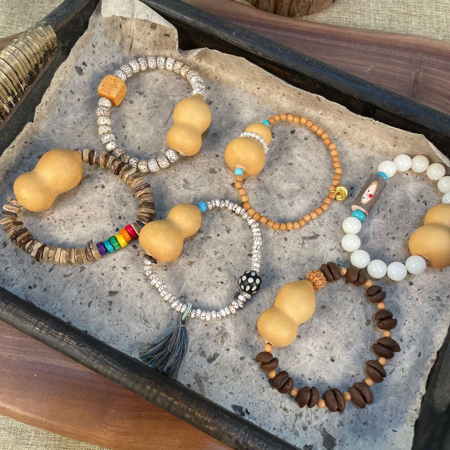 This collection of handmade bracelets highlights the auspicious gourd bead, long cherished as a talisman of prosperity, longevity & protection. Each bracelet is uniquely designed with complementary materials including wood, stone, seeds & resin, creating six distinctive styles. Elastic construction ensures a comfortable fit for everyday wear, while the artisanal charm makes these pieces both symbolic and stylish.