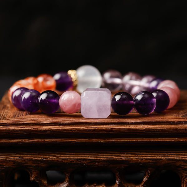 The Harmony Amethyst Multigem Bracelet – Cube Edition is artfully crafted with genuine amethyst and a curated array of vibrant gemstones, radiating color and positive energy. At the center sits a striking cube-cut amethyst, symbolizing clarity, wisdom, and spiritual connection. Drawing inspiration from the “Nine Purple Star” in Eastern tradition, this centerpiece also represents auspiciousness, joyful advancement, and new opportunities. Every bead is thoughtfully selected and strung to evoke a sense of harmony and elegance, making this bracelet not only a stunning accessory, but also a meaningful talisman for inner peace and positive transformation.