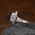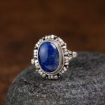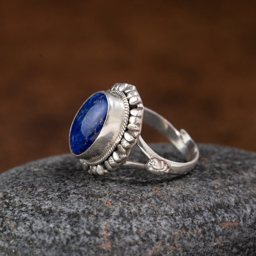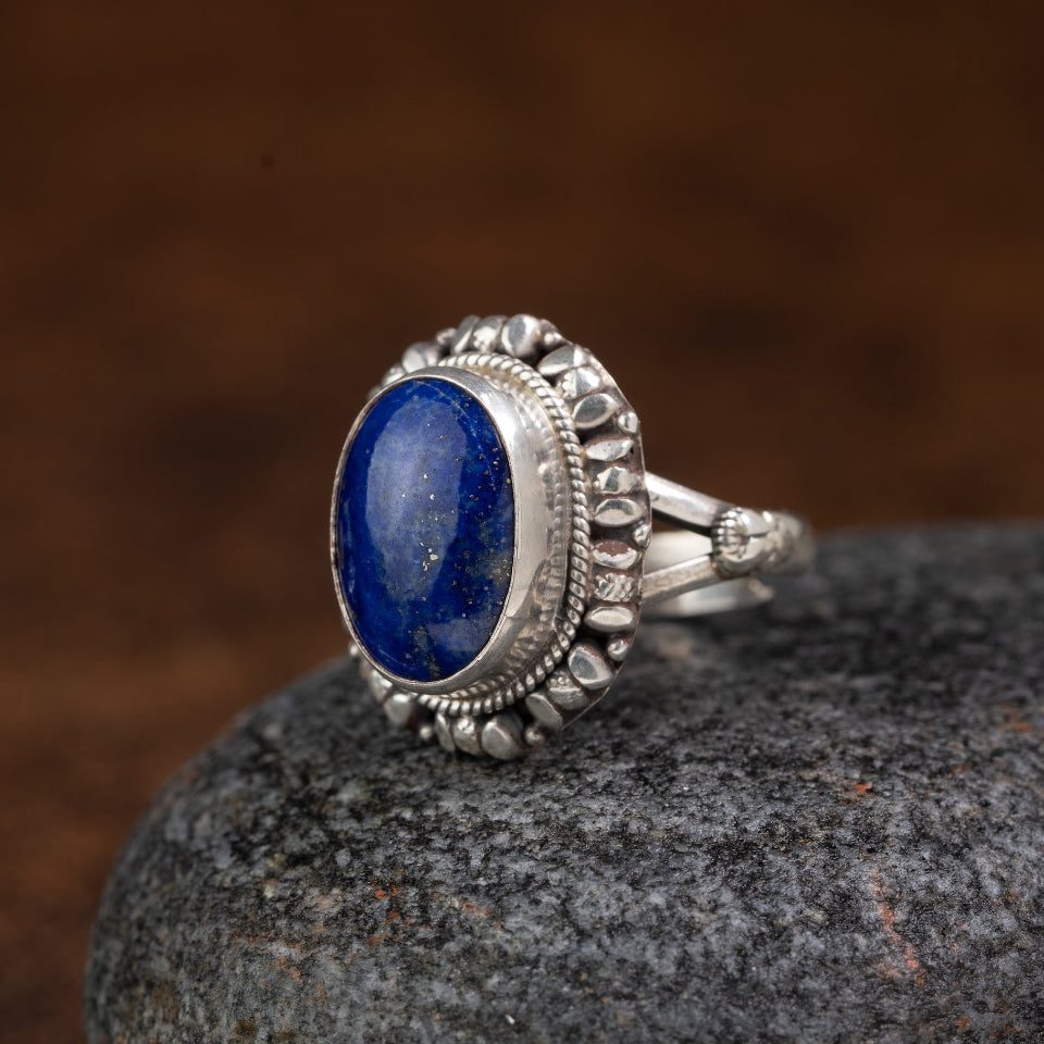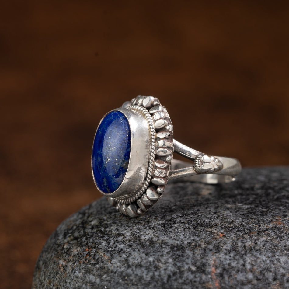 An oval lapis lazuli cabochon rests in a handcrafted 925 sterling silver halo—rope bezel and petal-like granulation framing the stone’s celestial blue and natural golden specks. Revered for clarity, truth, and gentle protection, this ring brings a serene, grounded presence to mindful everyday wear.