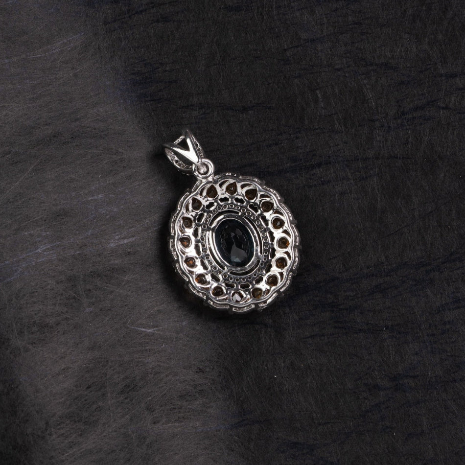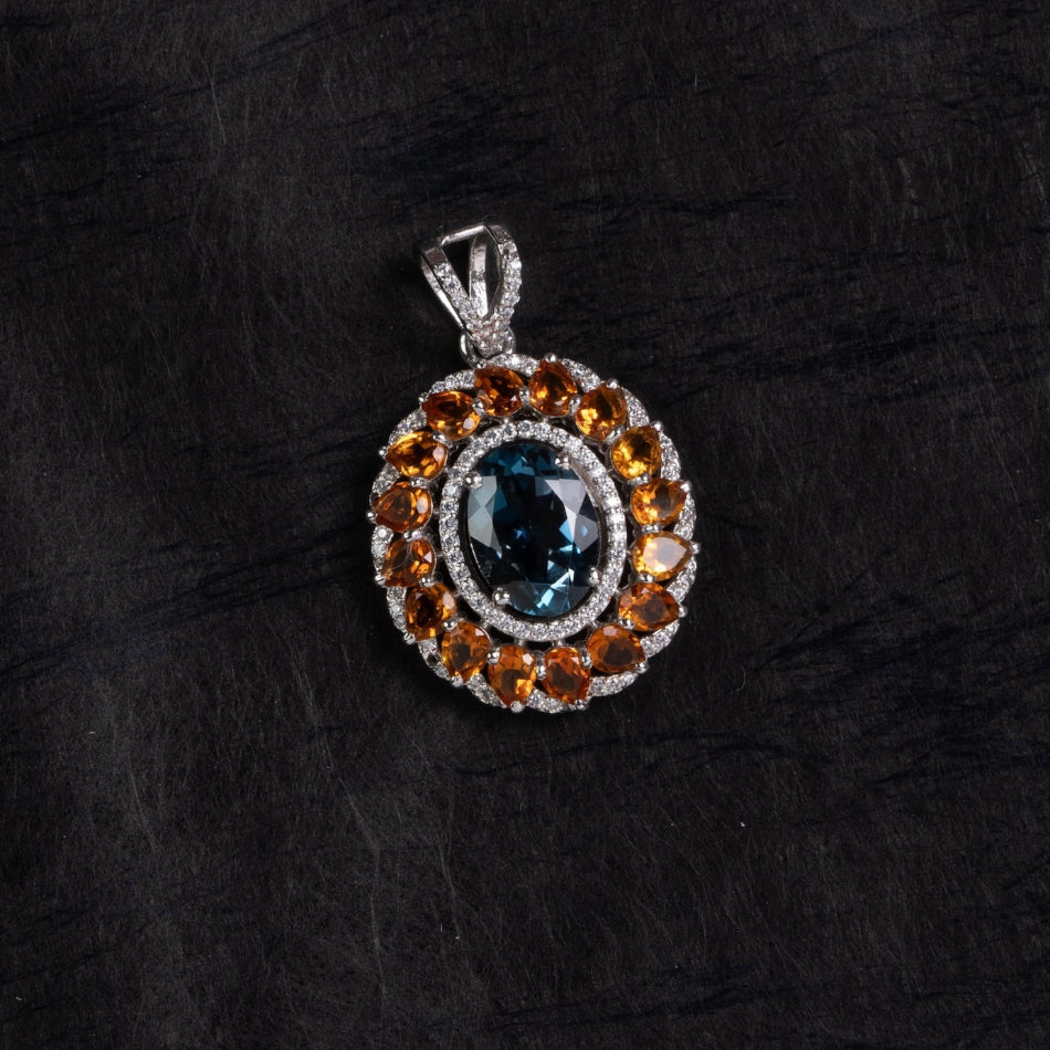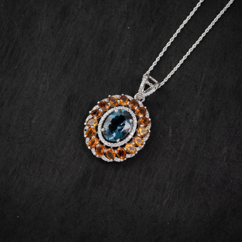 An ocean-deep London blue topaz glows at the heart of a citrine sunburst, encircled by a fine silver halo. Vivid yet refined, this pendant balances cool clarity and golden warmth—easy to style for everyday elegance or mindful moments.