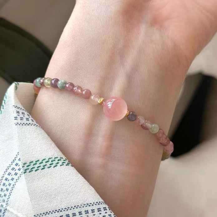 This bracelet is crafted from natural multi-color tourmaline beads, polished to reveal their vibrant hues. At its center rests a luminous pink focal bead, symbolizing love, compassion & renewal. The bracelet’s slim profile makes it ideal for stacking or wearing solo as a delicate yet meaningful accessory. Lightweight and versatile, it carries joyful energy and elegant charm for everyday wear.