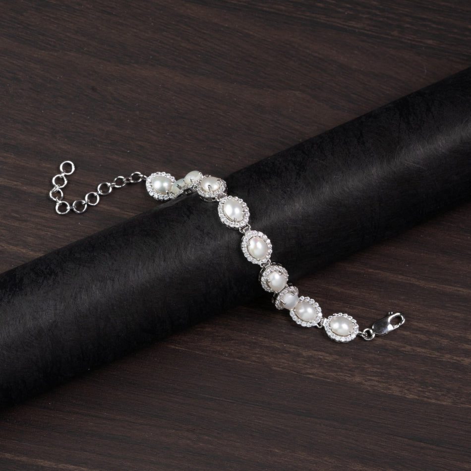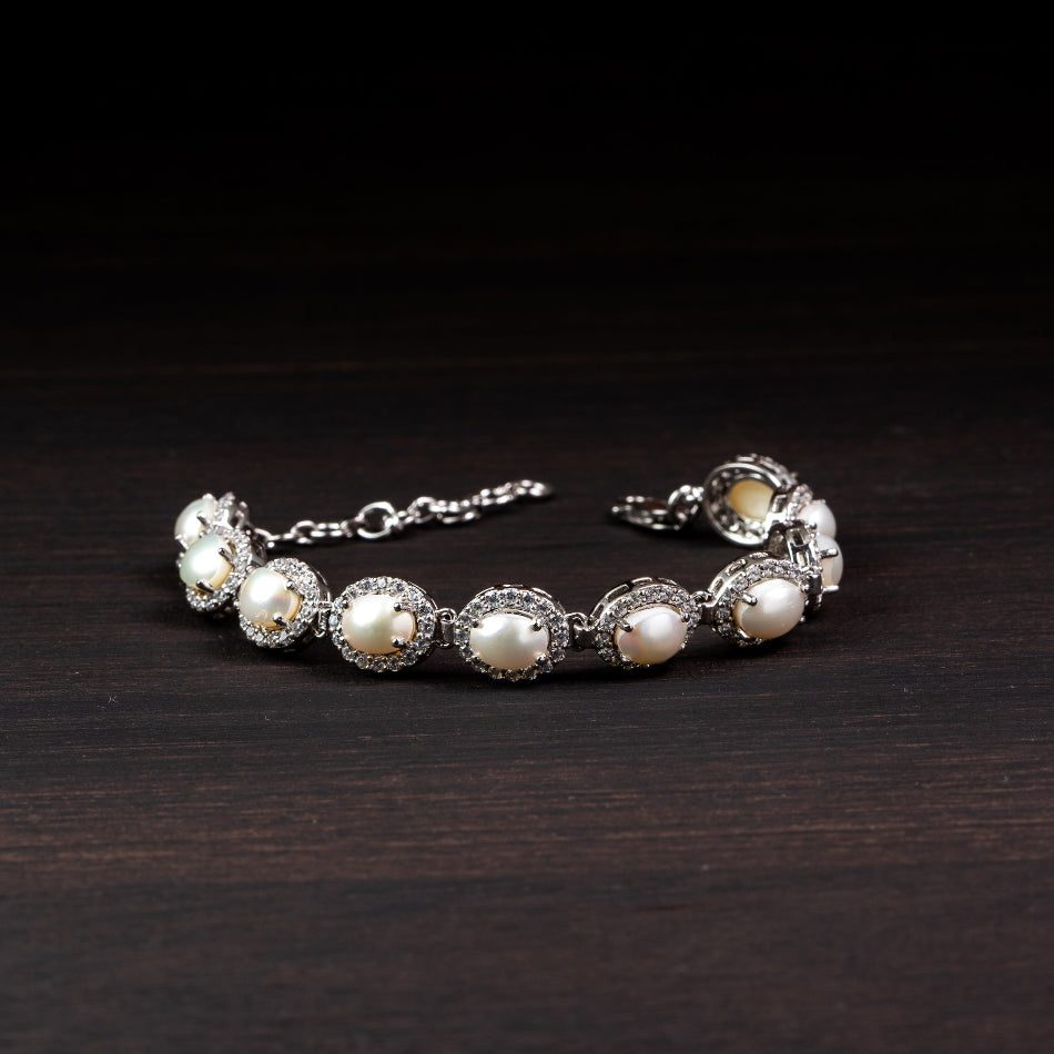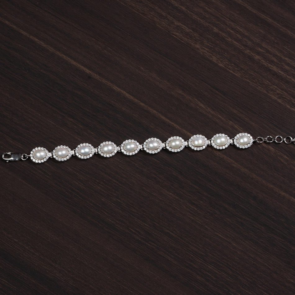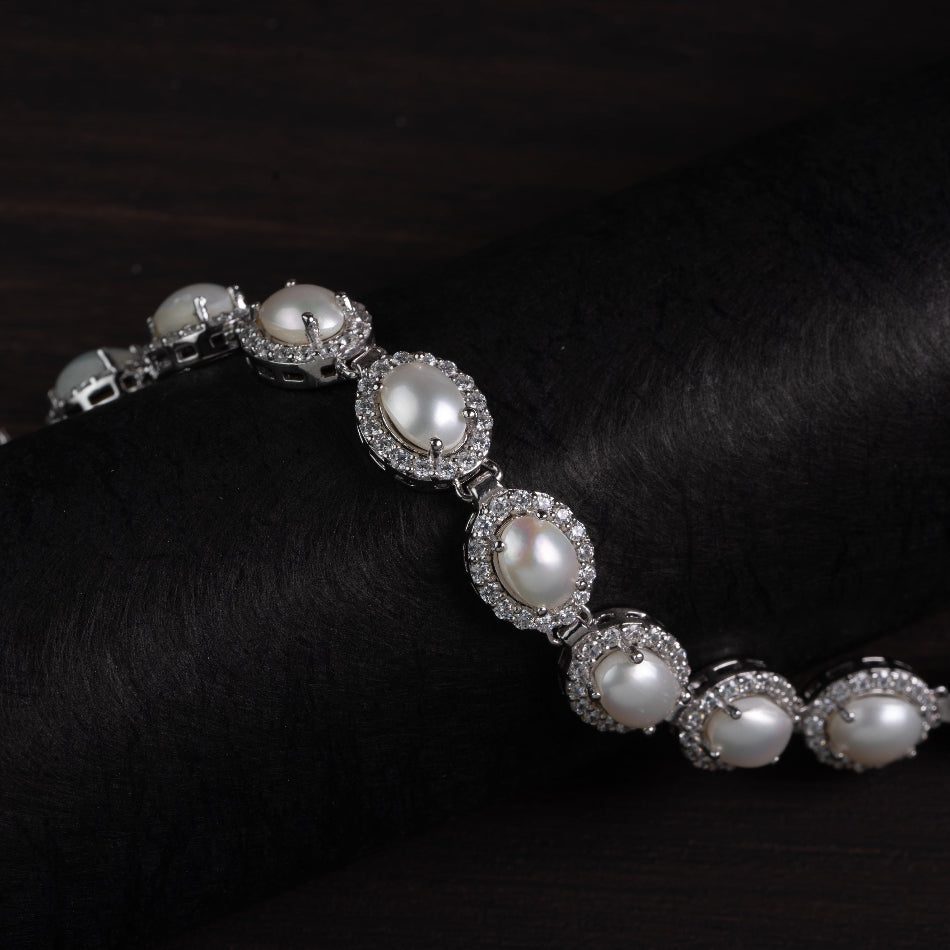 Sleek ovals of luminous pearl are framed by delicate halo accents and linked in polished 925 silver. Elegant yet effortless, this bracelet brings quiet poise and gentle radiance to everyday wear.