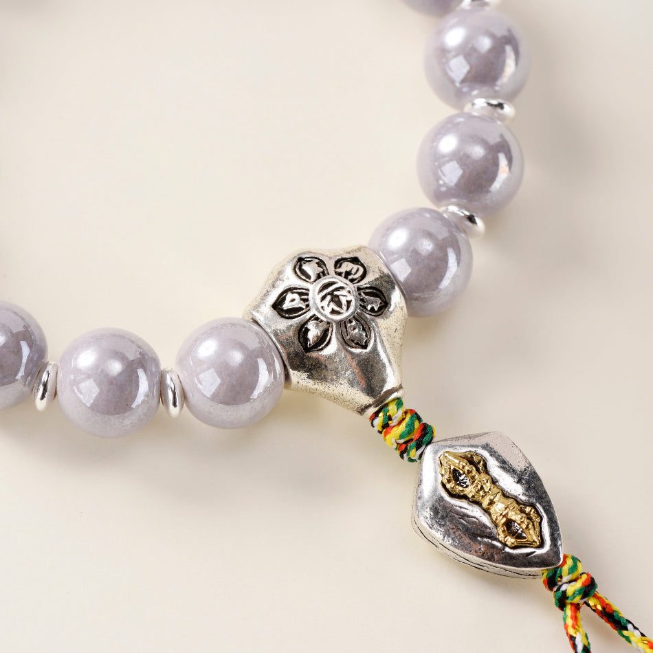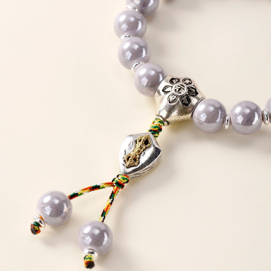 Soft-grey, pearlescent ceramic beads surround a lotus “guru” bead and a gold-accent vajra charm, finished with an auspicious five-color braided knot and twin tassel beads. The durable stretch cord slips on easily yet holds its shape for daily wear. This page is for the small / women’s size (10 mm beads; fits ~14–17 cm wrists).