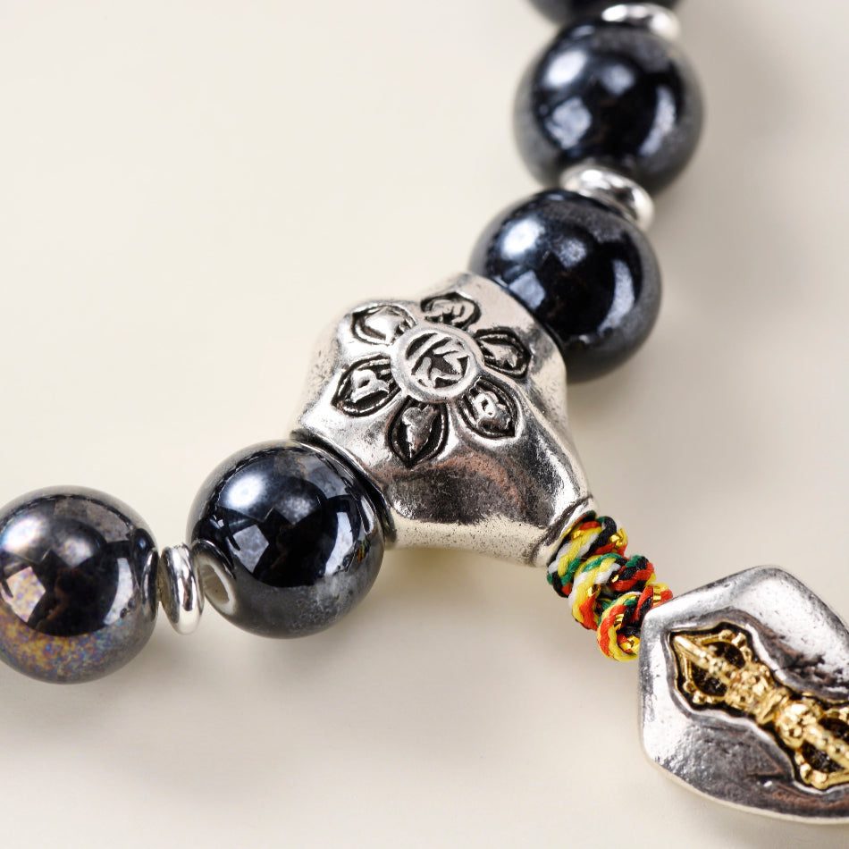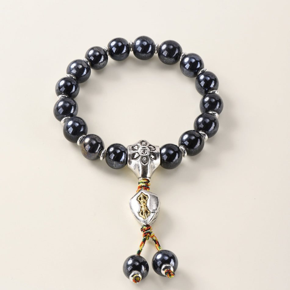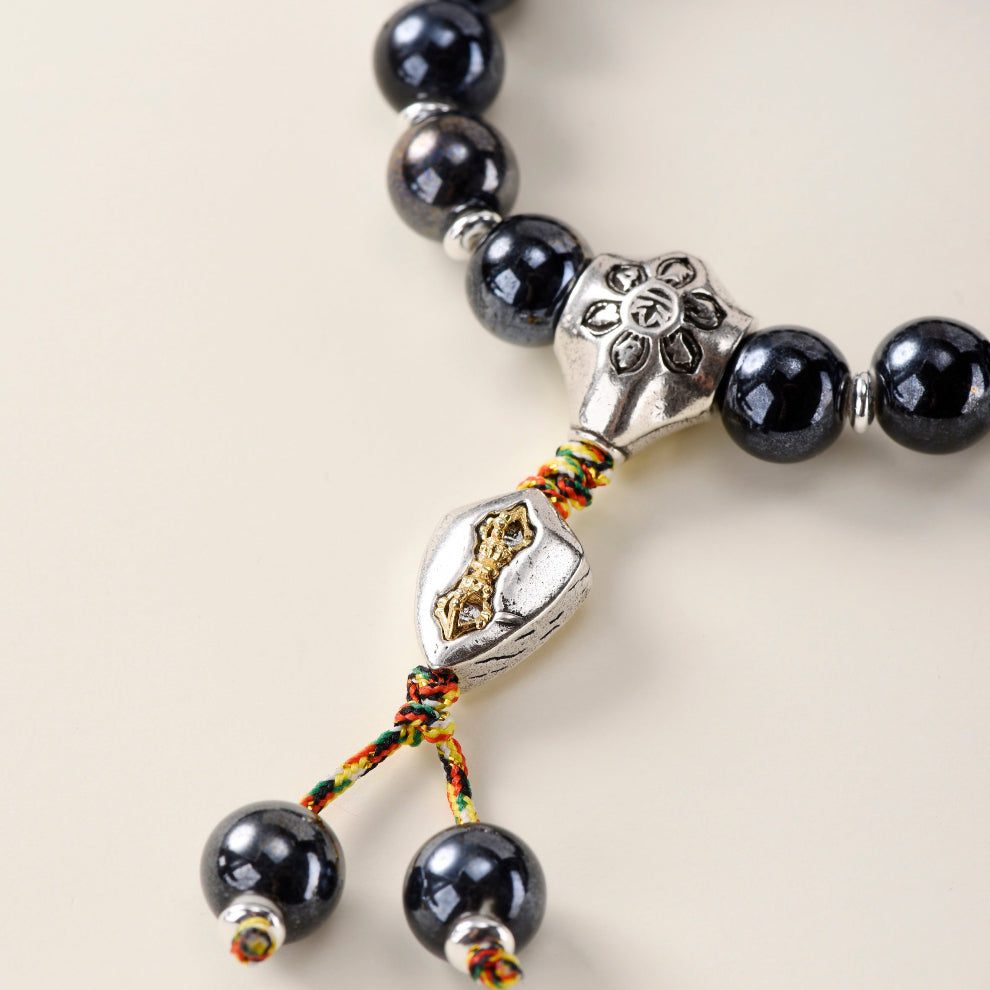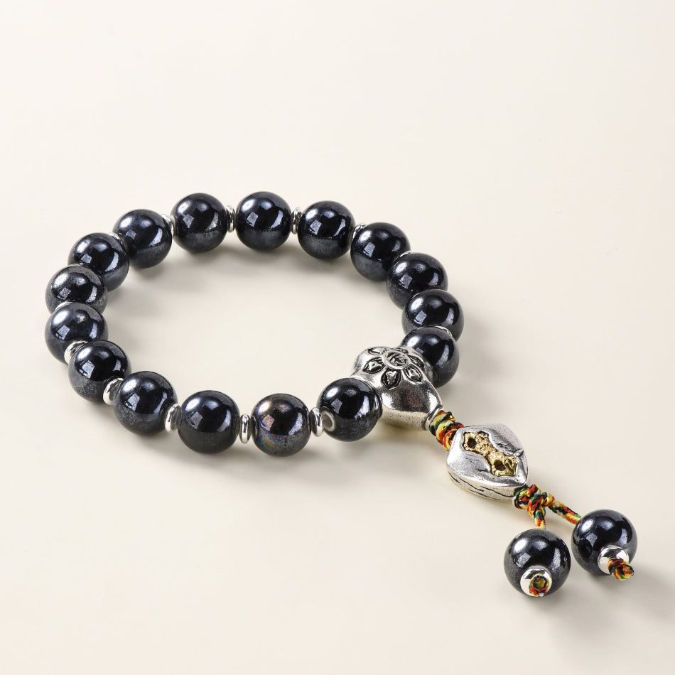 Glossy, pearlescent black ceramic beads are hand-strung with silver-tone lotus and dorje charms, finished by a multicolor luck cord and twin tassel beads. Available in two unisex sizes: Men’s/Large uses 14 mm beads and fits wrists ~17–19 cm, while Women’s/Small uses 10 mm beads and fits wrists ~14–17 cm. Comfortable for daily wear and intended to invite prosperity with calm, grounded energy.