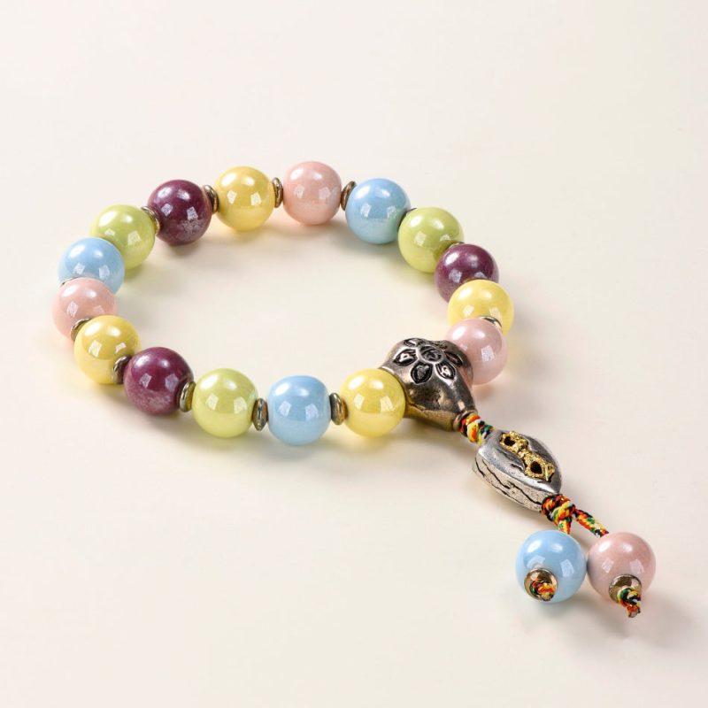 Macaron-pastel porcelain beads (10 mm) glow with a soft pearlescent sheen. A silver-tone lotus center bead and a gold-tone dorje charm lead the strand, finished with a playful tassel and two bead drops. Lighthearted yet serene, this small-size bracelet slips on easily and brightens everyday looks. Best for 14–17 cm wrists.
