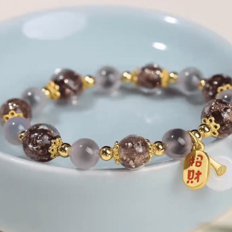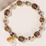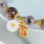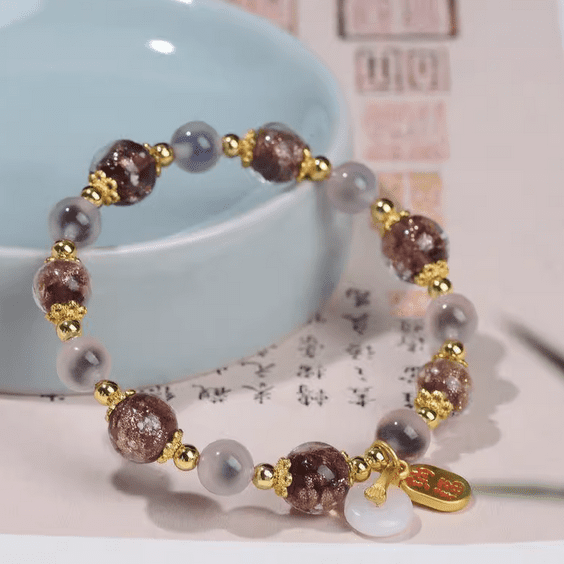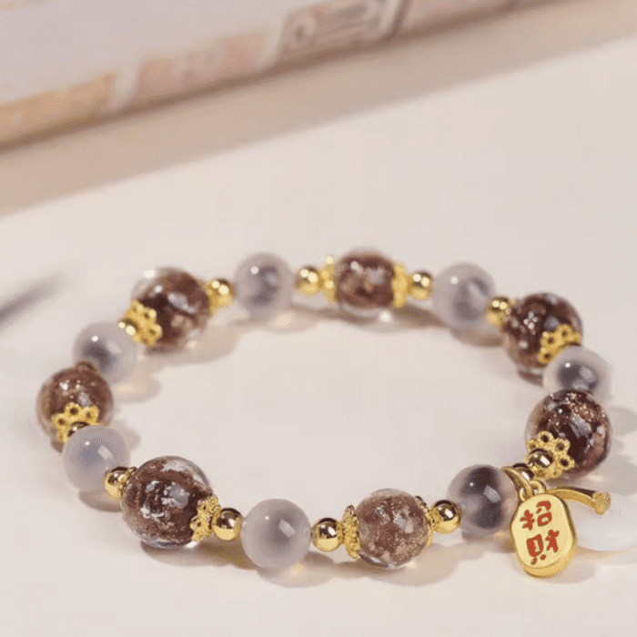 This exquisite bracelet pairs soft pink agate with shimmering luminous glass, highlighted by golden accents and a delicate white peace-disk charm. The “Fortune” tag embodies blessings of prosperity, while the smooth glass catches light with subtle iridescence. A refined piece designed to attract calm energy and auspicious flow in every moment.