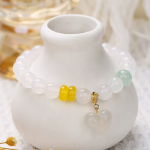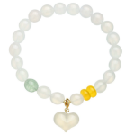 The Pure Heart Bracelet radiates quiet elegance through the soft glow of white agate and warm chalcedony. A carved jade-like heart charm hangs at its center, representing sincerity, compassion, and balance. The design features a touch of green and golden-yellow accents, reflecting harmony between clarity and optimism. Minimal yet full of meaning, it carries the gentle energy of peace, protection, and emotional renewal.