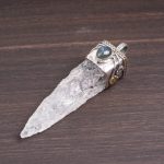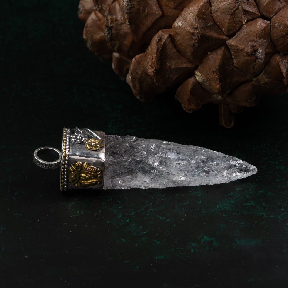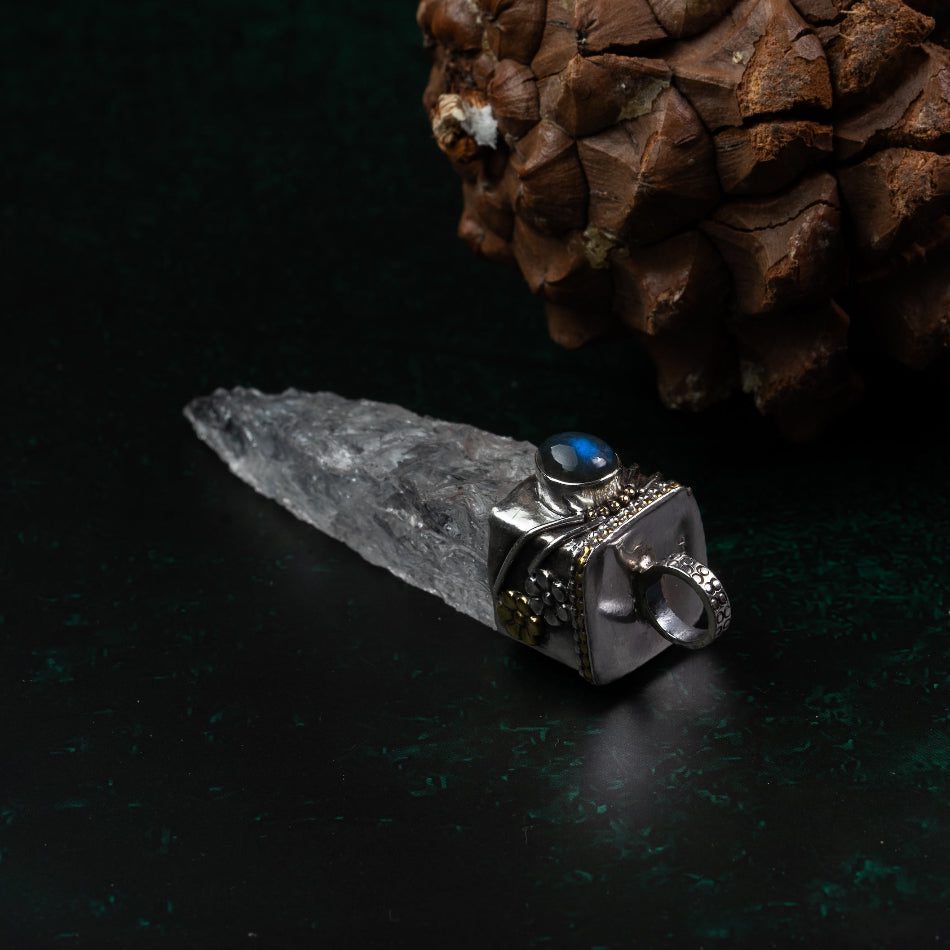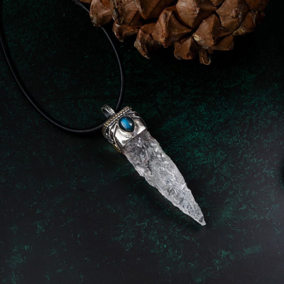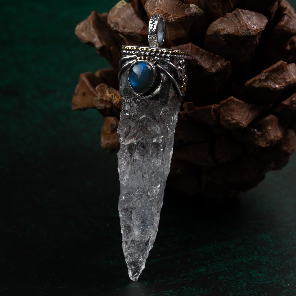 A dramatic shard of raw white crystal is crowned with an artisan-worked silver cap and a deep blue cabochon accent. Prismatic and powerful, this pendant channels cool, focused energy—perfect for elevating everyday looks while keeping your aura clear and composed.