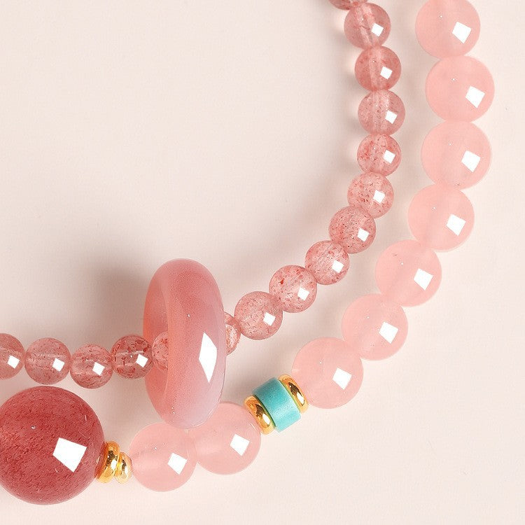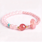 This bracelet blends the soft glow of rose quartz with the vibrant energy of strawberry quartz. A polished rose quartz donut bead and a strawberry quartz focal highlight the design, accented with golden spacers and a turquoise detail for contrast. Hand-strung on elastic, the bracelet wraps gracefully around the wrist, symbolizing love, renewal & emotional balance—an elegant talisman for daily wear.