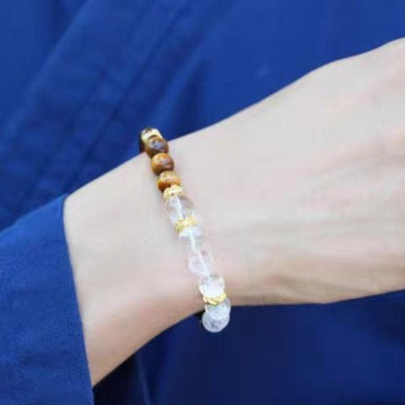 Warm golden tiger’s eye meets light-catching crackle clear quartz (“firework” quartz) for a bracelet that feels grounded yet bright. The stones are hand-strung so the quartz arc lifts the front of the design while tiger’s eye brings steady depth around the wrist—cool at first touch, then gently warming to your skin.