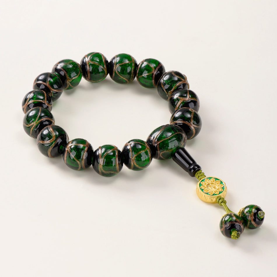 Hand-finished ash-glass beads in a rich verdant glaze show subtle bronze tracery, framed by dark spacers and finished with a gold-tone lotus medallion and twin dangle beads. Offered in Large and Small sizes, this design brings a composed, professional energy to your day.