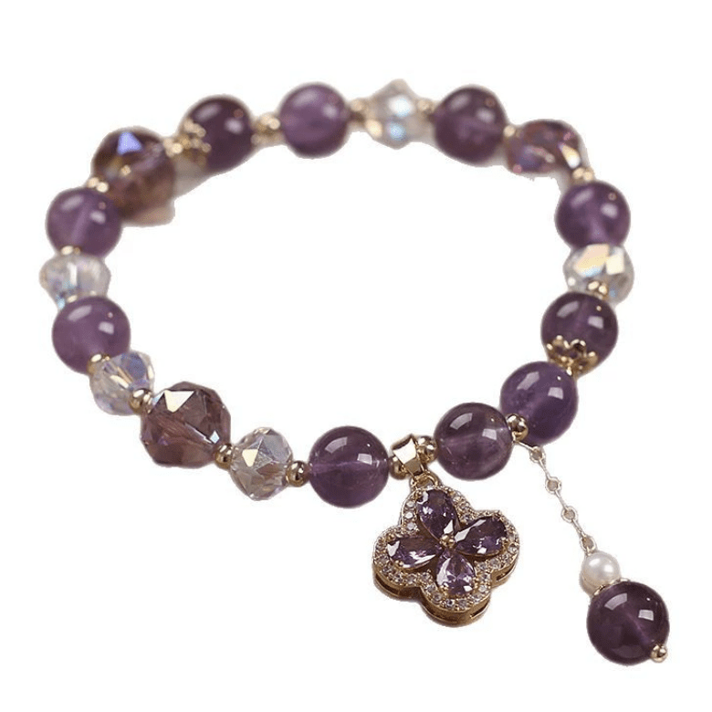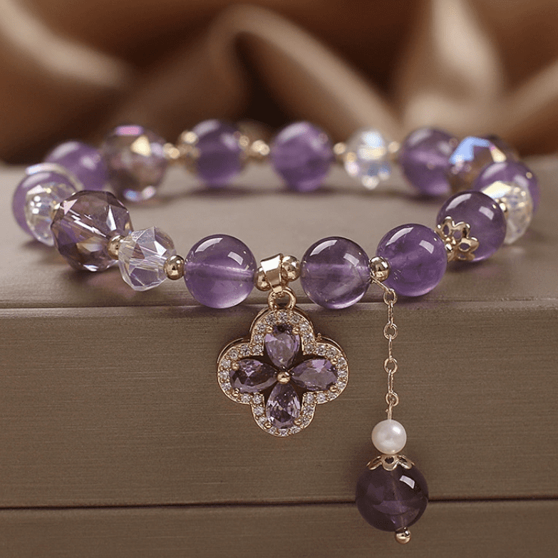 Graceful and radiant, the Violet Clover Bracelet weaves together natural amethyst crystals and a four-leaf clover charm of fortune. The amethyst’s serene violet glow embodies wisdom and tranquility, while the clover—symbol of luck and divine favor—adds a touch of celestial blessing. Accented with shimmering crystal facets and a gentle pearl drop, it’s a piece that balances elegance with soulful intention.